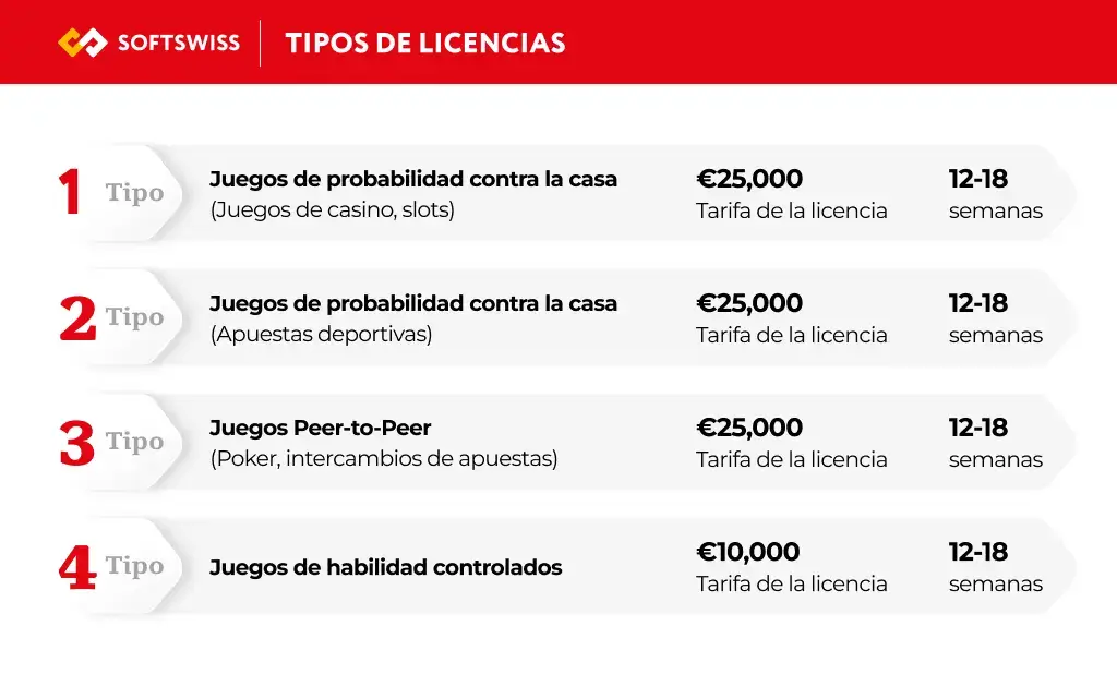 Hay cuatro tipos principales de licencias de juegos que se dividen entre licencias de servicios de juegos (para B2C) y licencias de suministro de juegos críticos (para B2B). Estas licencias están disponibles tanto para el sector de 'Juegos a distancia' como para el de 'Juegos terrestres'.