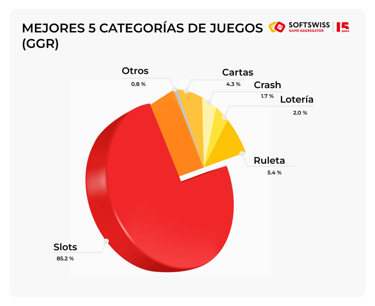 En 2023, las slots siempre se situaron como la categoría de juegos más popular, tanto en términos de ingresos brutos del juego (GGR), como en el número total de apuestas, logrando el 85,56% del mercado. Aunque a principios de 2024 hubo una ligera caída hasta el 83%, las expectativas indican que la popularidad de las slots se mantendrá por encima del 80%.
