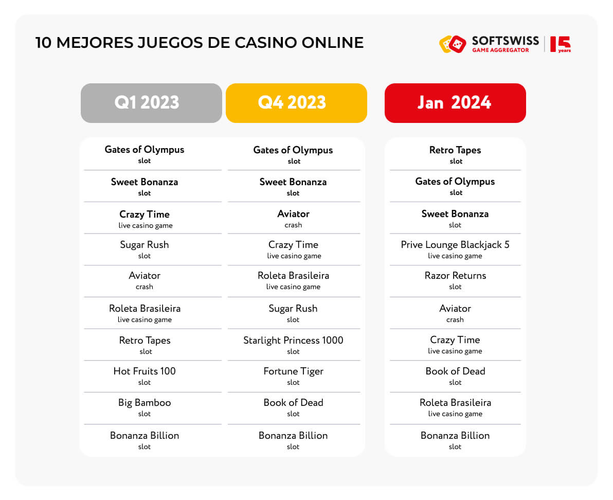 Durante el primer trimestre de 2023, el juego de casino en vivo Crazy Time ocupó el tercer lugar y cayó al cuarto a finales de año. Sin embargo, a principios de 2024, Prive Lounge Blackjack 5 lo superó y consiguió una clasificación más alta.