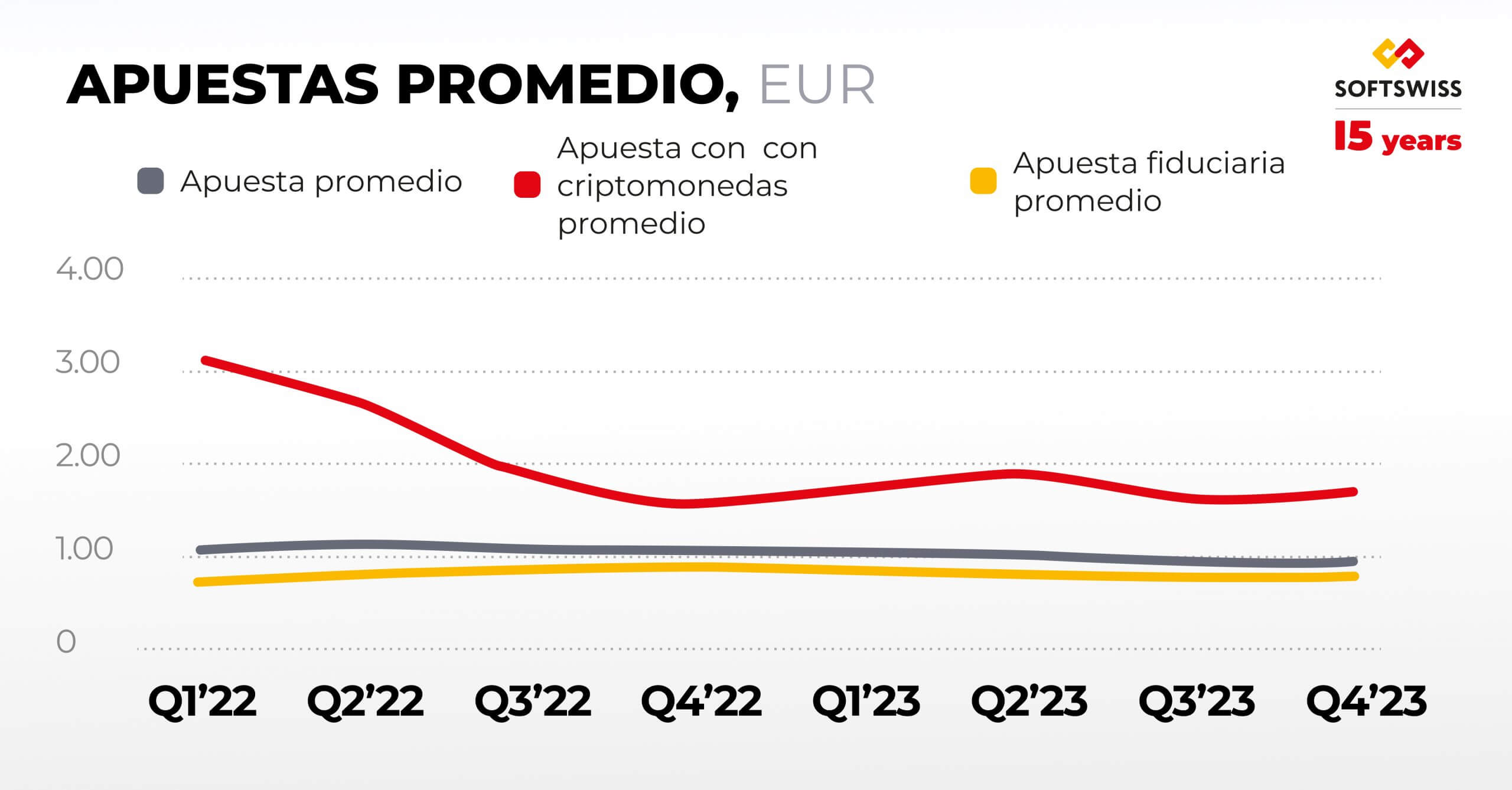La apuesta fiduciaria promedio se mantuvo estable en torno a 0,82 euros durante el año anterior. A pesar de las fluctuaciones en la apuesta con criptomonedas promedio durante 2023, que osciló entre 1,59 y 1,88 euros, los cambios parecen modestos en comparación con la caída del doble observada en la apuesta con criptomonedas promedio durante el cuarto trimestre de 2022, que alcanzó los 1,56 euros. Esto indica un cierto nivel de estabilización en la apuesta con criptomonedas promedio a lo largo de 2023.