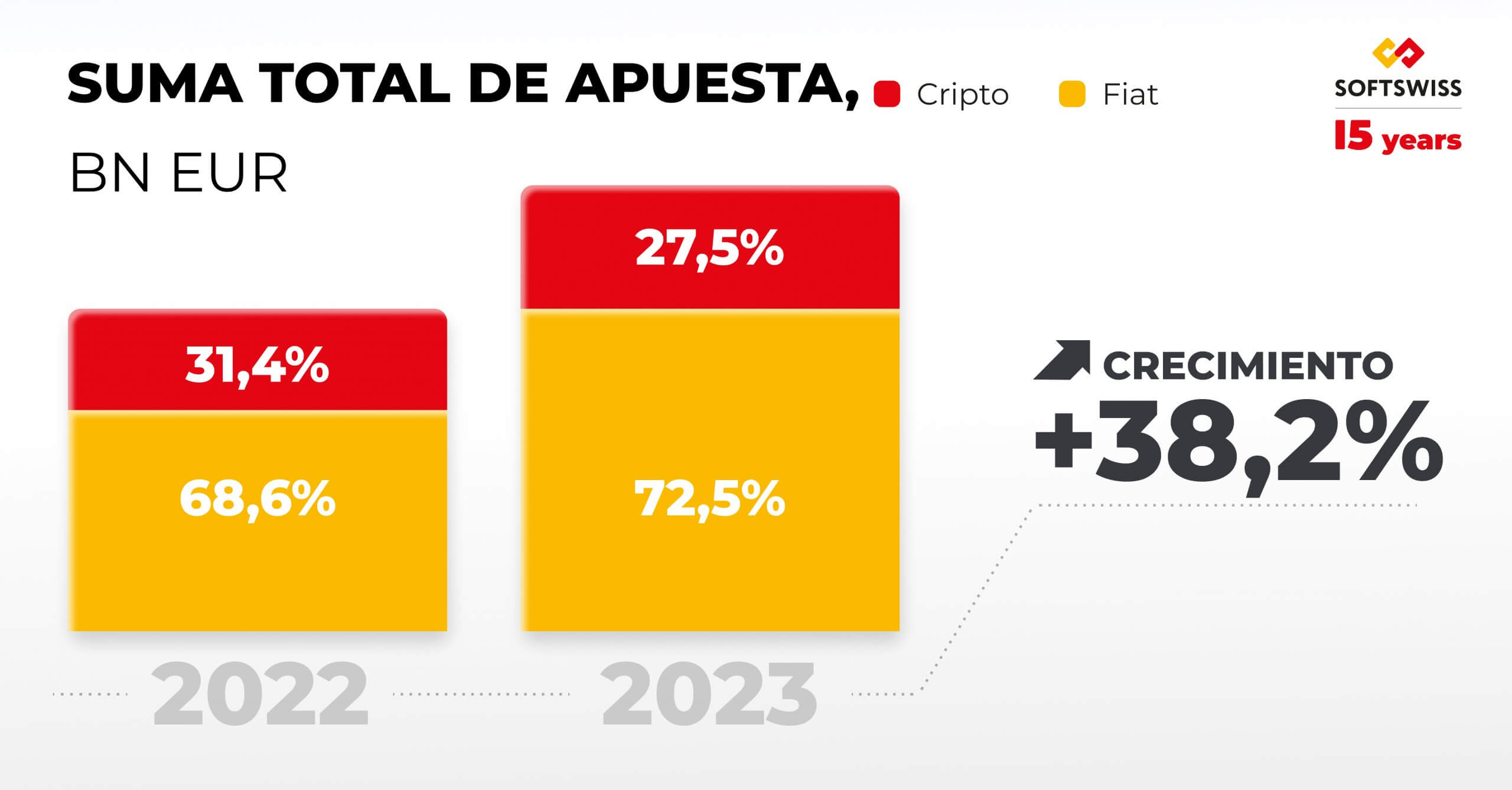 Según los datos de SOFTSWISS, el mercado iGaming tuvo una expansión estable en 2023. En términos absolutos en euros, la suma total de apuestas creció un 38,2% interanual. Al mismo tiempo, el número total de apuestas mostró un aumento aún mayor, superando el 51,2%.