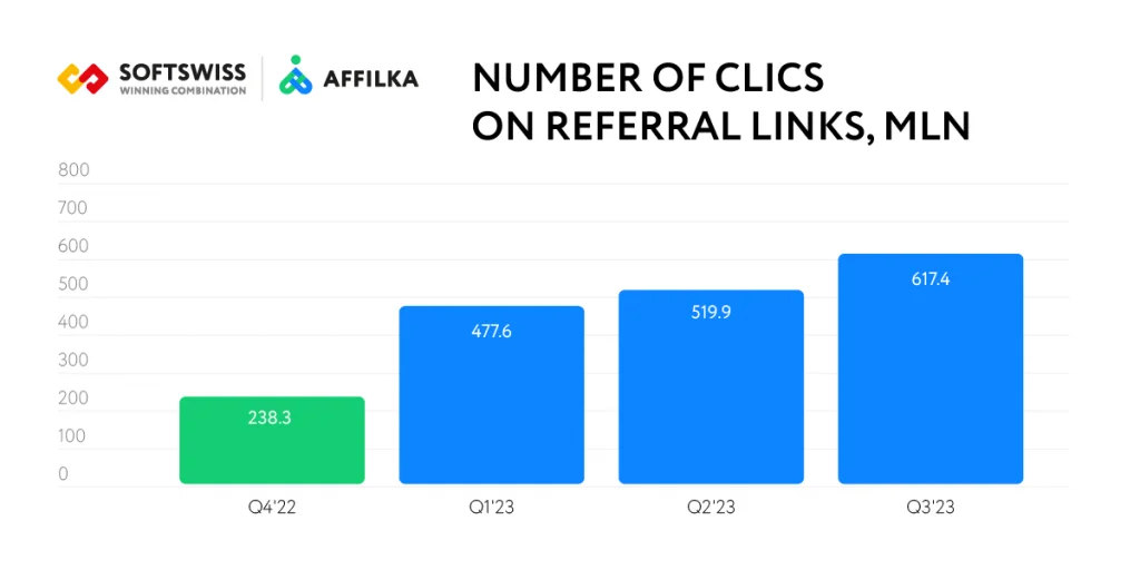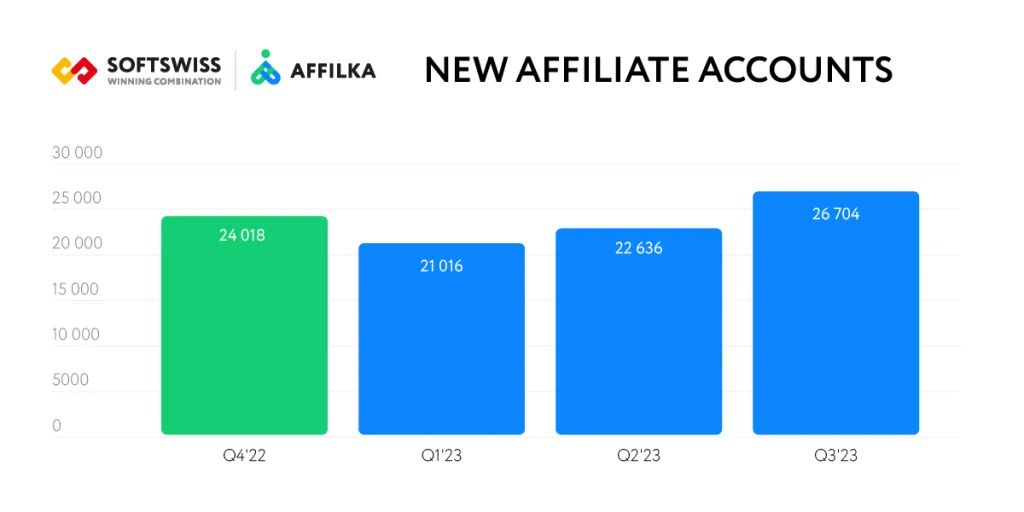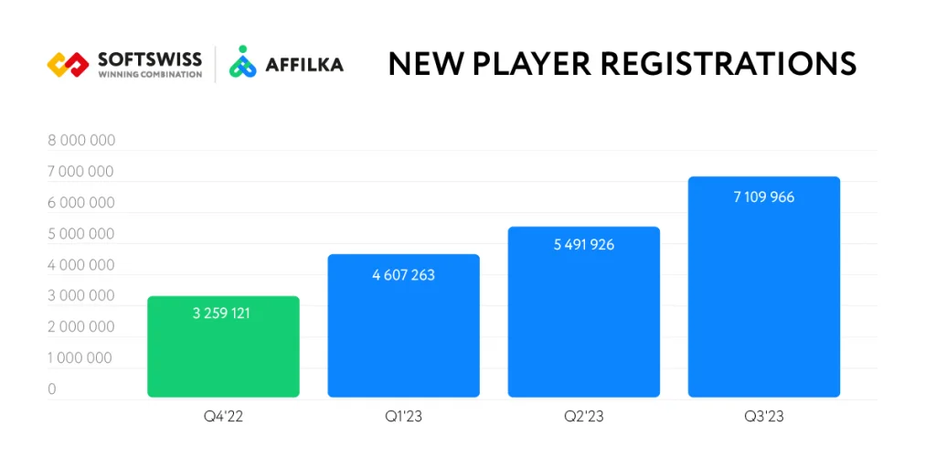 The surge in new affiliate accounts has sparked an accelerated growth in new player registrations – more than 17 mln since the beginning of the year. When comparing the first three quarters of 2023 with the same period in 2022, a significant increase of over 2.5 times in this crucial metric becomes evident. This statistic underscores the great importance of efficient affiliate management in elevating success within the iGaming industry.