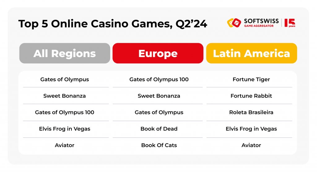 SOFTSWISS has analysed and compared player preferences in its focus regions and identified regional trends. Crash games are more popular in Latin America than in Europe. In Q2 2024, Aviator, the most popular crash game, ranked in the top 5 games globally and in Latin America, while slots dominated the European market. The share of crash games in Latin America was 3.9% of all games in Q2, compared to less than 1% in Europe.