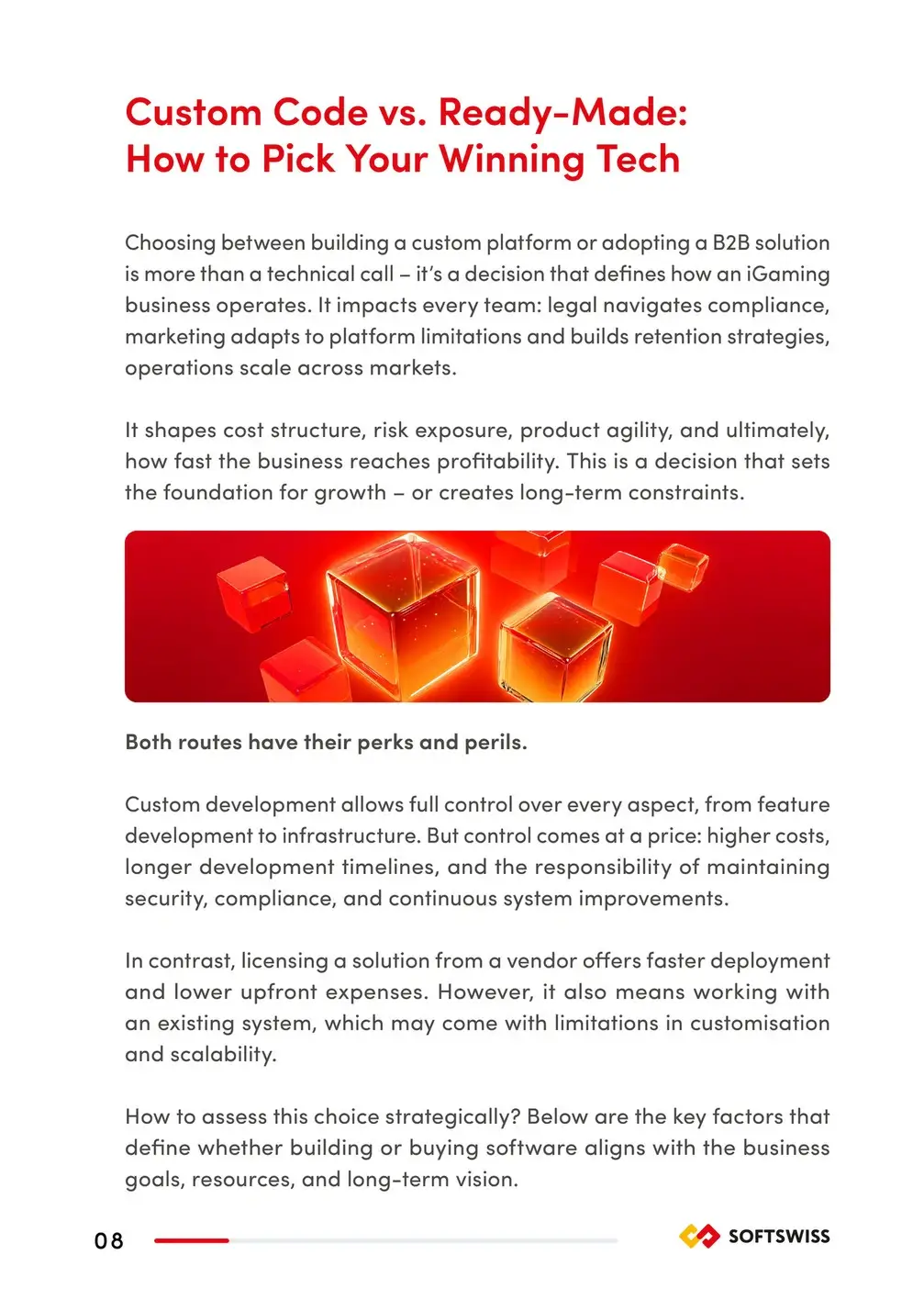 This ebook explores the practical dimensions of launching an iGaming platform – whether building from the ground up or licensing an existing solution. It covers cost structures, development timelines, and team requirements, offering a grounded view of what each path entails.